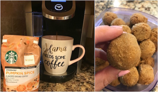 As far as the nights go, she is still sleeping in the bassinet in our room, and she tends to wake up right now between 2-3 am, and I feed her. She then wakes again between 5-6 am, but we try to keep her in the bassinet until 7 am, so we give her a pacifier, and she typically falls back asleep on her own until 7 am. Meanwhile, I head downstairs at about 6 am to get my day started, and have about 1 hour of quite time before she wakes. I head straight to the coffee machine and brew a cup of coffee, and pull either a protein ball or muffin out of the freezer and enjoy it while my coffee is brewing. I like to have something small to eat because not only am I so hungry when I wake up (thanks to breastfeeding), but I also like to get my metabolism going for the day, and have something light before my workout! By the way- who else is loving pumpkin spice coffee right now!?! It's my jam!!!