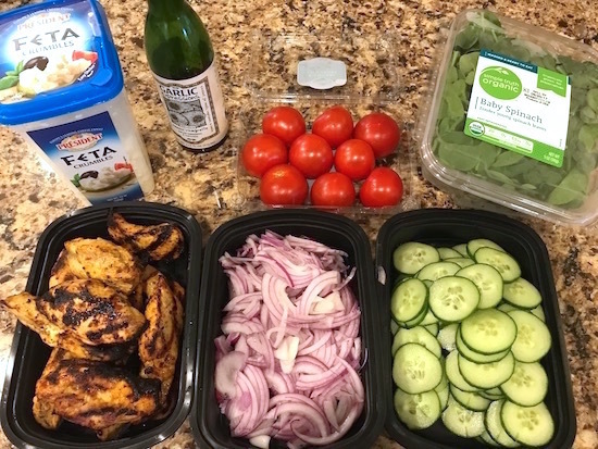 This week was my Grilled Mediterranean Chopped Salads! I could have put them together ahead of time, but there really is no need since I work from home, and I feel they are fresher tasting if I wait to put them together just before eating them.