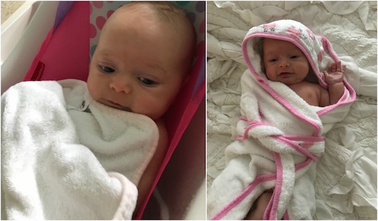 Around 6:50 we head upstairs to bathe Maddie, and get her ready for bed. I then feed her around 7-7:30 pm, and she falls asleep pretty easily!