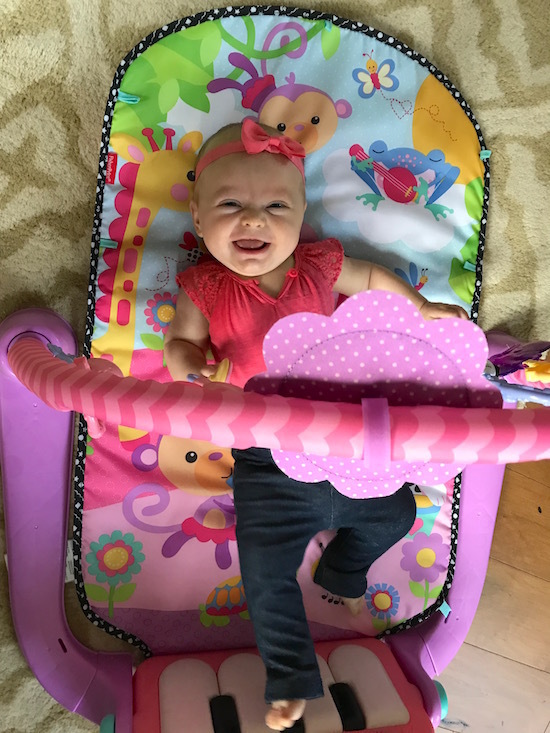 After eating breakfast, Maddie is already up from her first nap for the day (around 10 am), so I feed her the second feeding for the day! After she eats she loves to go on her play mat and do some sort of activity!
