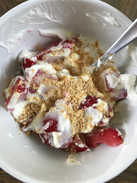 After lunch I enjoy some kind of Dashing Dish baked good or some plain Greek yogurt sweetened with stevia, and frozen strawberries, and a sprinkle of peanut flour! (This is typically where I add extra calories in my day due to my increased caloric needs for breastfeeding).