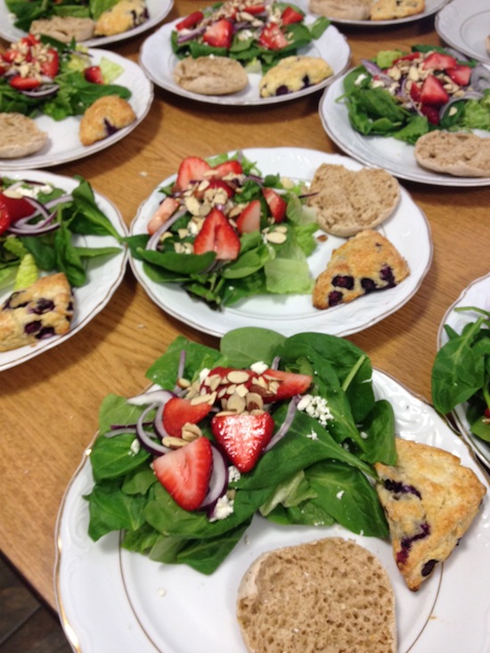 Followed by a strawberry spinach salad (which I had the pleasure of preparing), a scone, and an english muffin, which was later topped with an egg, asparagus, and hollandaise sauce.