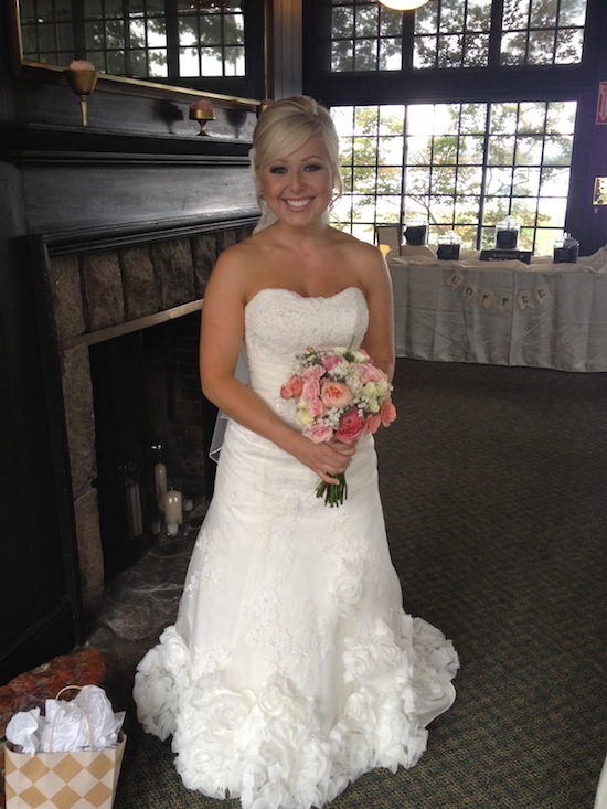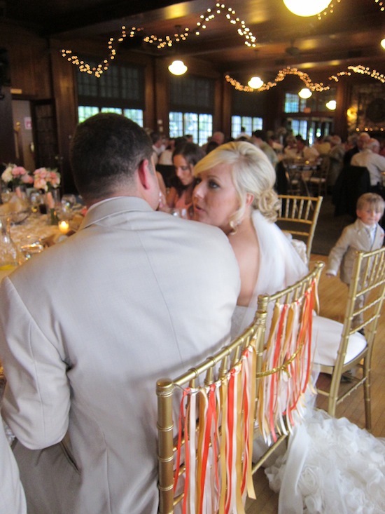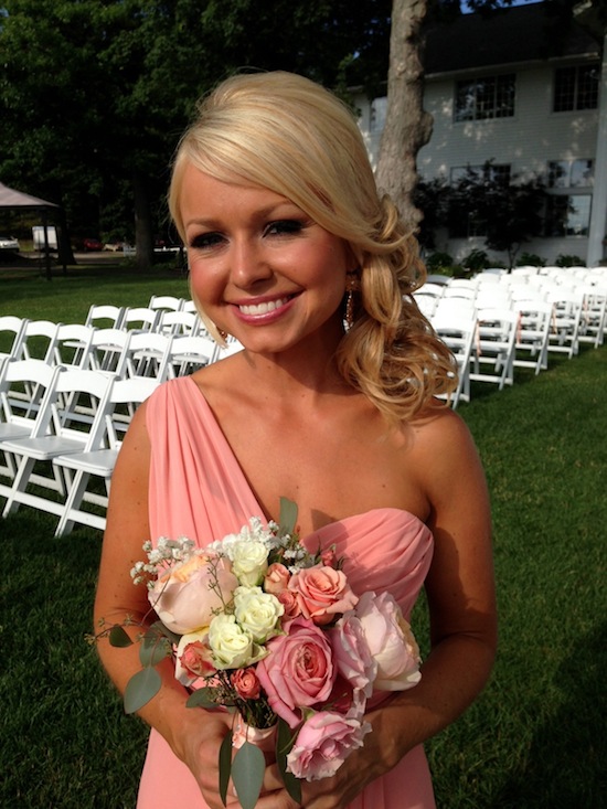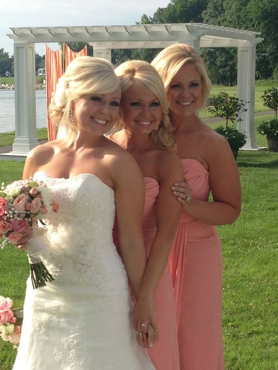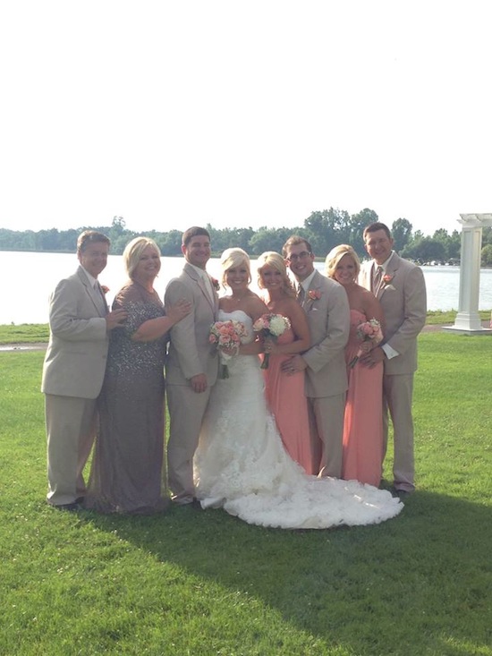 My sister picked a coral shade for the bridesmaid dresses. The dresses were made by Watters & Watters.