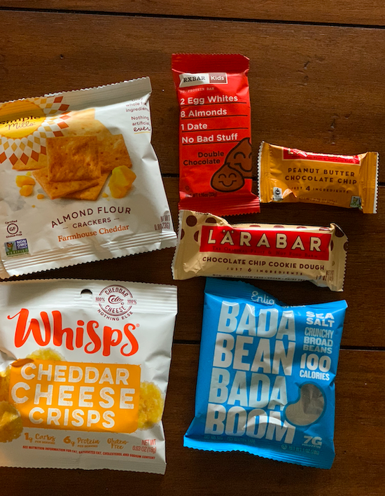 Favorite On The Go Snacks: Simple Mills Almond Flour Crackers, Peanut Butter Cookie Lara Bars, RX Bars, Bada Bean Bean Crisps, Whips Cheese Crisps