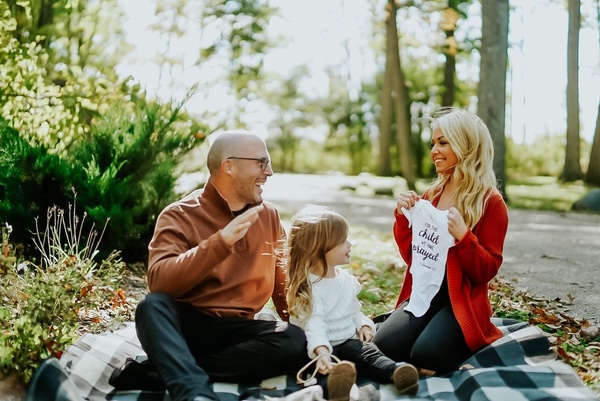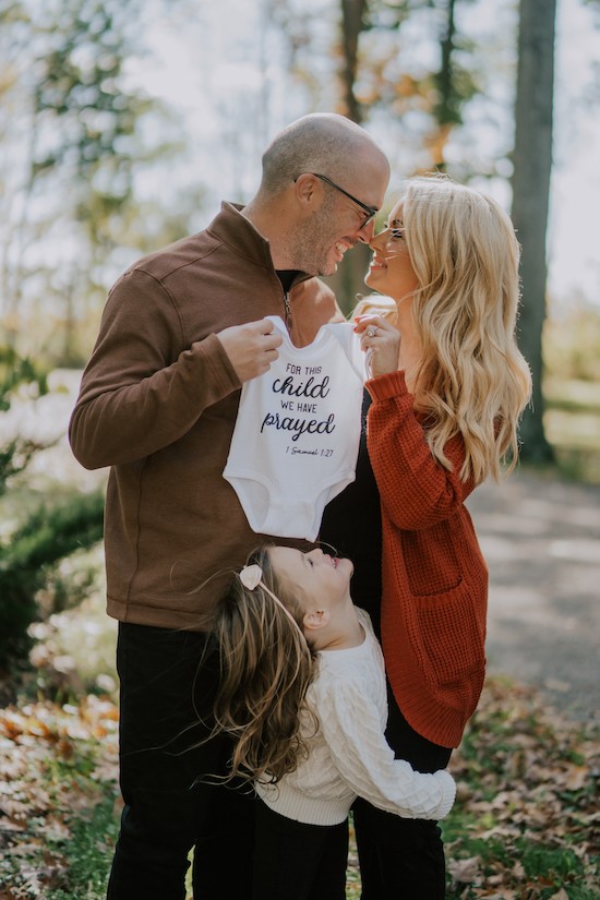 I found out I was pregnant on October 17th, on the day that we had a family photoshoot scheduled. The "God" thing about it was, this was the same photographer that shot our announcement photos when we were pregnant with Maddie, and the baby we lost. God brought it full circle in the fact that I found out on the day we were getting ready to take photos, which set up the perfect opportunity to tell Sean in a memorable way! The other neat thing about it was our photo session was actually scheduled the week before, but got rained out, and the date that it fell on was the morning I was able to take a pregnancy test, which was positive!