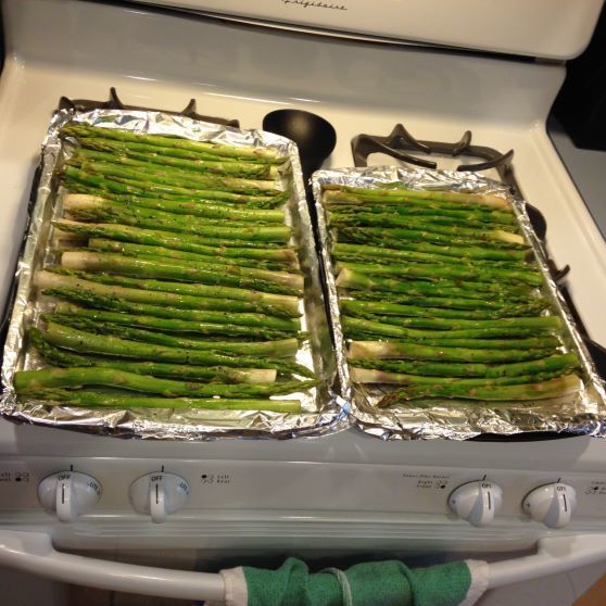 I keep rotating veggies until everything is done. In between veggie batches, I work on getting meat ready to cook. As soon as your veggies are done, turn the oven temp down for the meat!!