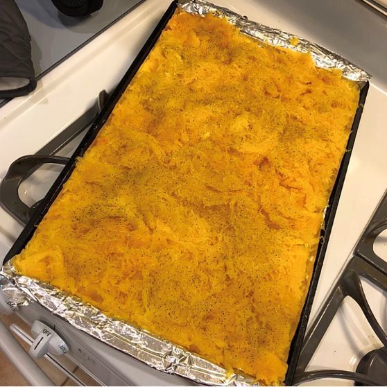 Most people just cook their spaghetti squash and pull it out with a fork, and I find that best if using for noodles, but I really like roasting it after the noodles are cooked and eating it as a side with just seasonings! Totally different flavor and texture! Same process as above for cooking on a baking sheet if you want to try it!