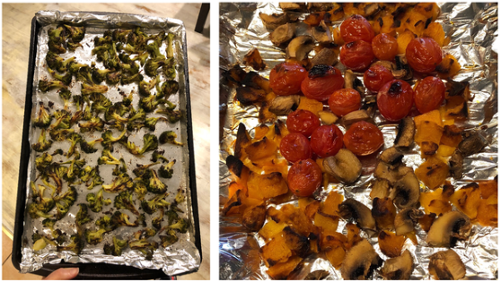 First thing is first, preheat the oven! Since veggies roast at a higher temperature than other things, it makes sense to do them in batches until done, then I turn the oven down for my meat and baked items. If the meat is going in the oven, I have it ready to go once the veggies are out. With most recipes, you don't want to put your food in until the oven is totally preheated, but I find with roasting vegetables, it does not affect the outcome to put them in while it is still preheating so I start with veggies and stick them in even if the oven is not preheated all the way.