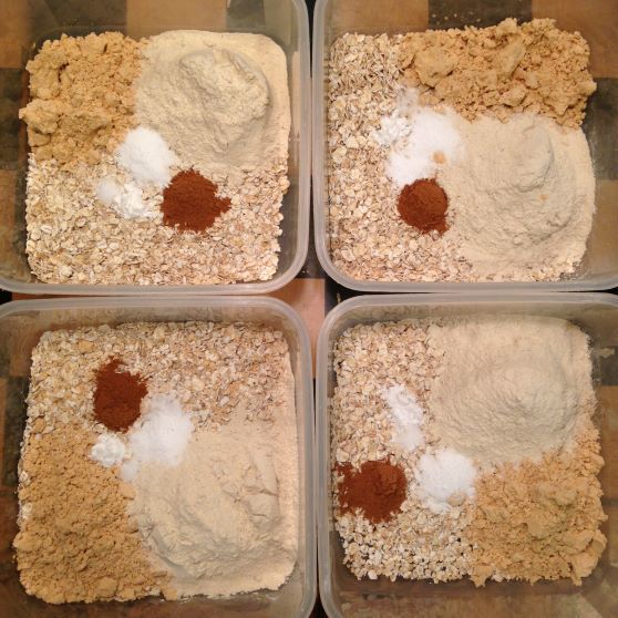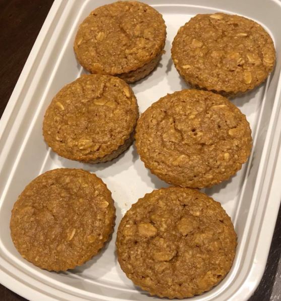Next thing will be breakfasts! Usually overnight oats and some kind of healthy baked good. While the meat is cooking, I mix up a batch or two of muffins and have them ready to go in the oven when the meat comes out! If the meat you are cooking doesn't go in the oven, make sure you don't put your baked good right in after the veggies. The oven temp will need a few minutes to drop once you turn it down, otherwise they cook unevenly. A few breakfast favorites are the Sausage Cheddar Breakfast Muffins, Peanut Butter Cookie Overnight Oats, and PB2 Oatmeal Breakfast Cookies (only, we make them as muffins). A tip for oats: if you want to make more than 2 days worth, but don't want them to get yucky in the fridge, just measure out the dry ingredients into Tupperware. Then you add the wet the night before. Saves time by allowing you to make more at once without them spoiling! See the photo below!