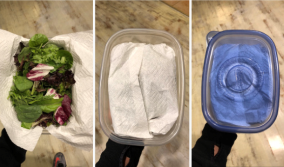 If making something like a salad to take with you to work, you can divide the greens and wrap them in paper towels so they don't get soggy by the time I you eat them. Then pack the salad toppings separately to dump in a bowl with your salad at work!