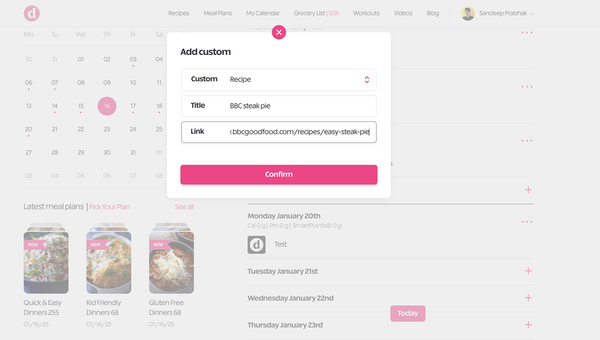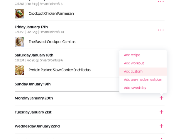 1. Head to your meal plan builder, then click the + on the day you'd like, and click "add custom" to add a custom recipe from the internet.
