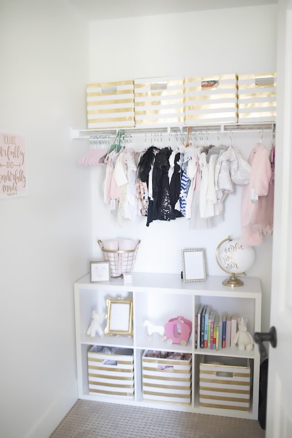 I have to say, I was quite excited to put together her closet! The baskets are from Amazon, and the top ones have clothes that she can't fit into now, organized according to months of clothing. The nicer clothes are organized on the hangers in age ranges as well. The bottom baskets hold things like blankets, toys, etc.