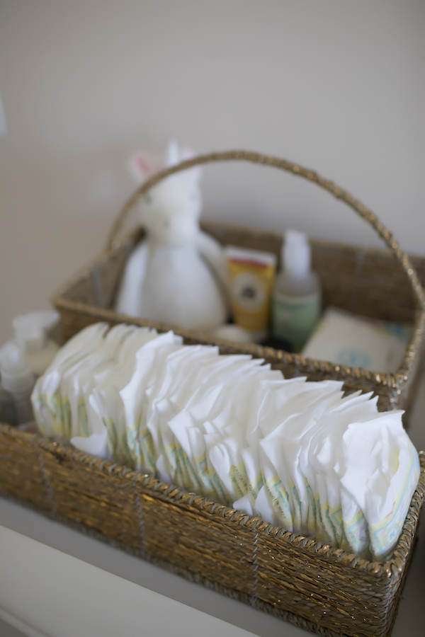 I organized the stuff I would use most frequently in a basket on top of the changing table, and tucked the rest away in the drawers.