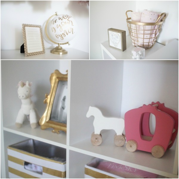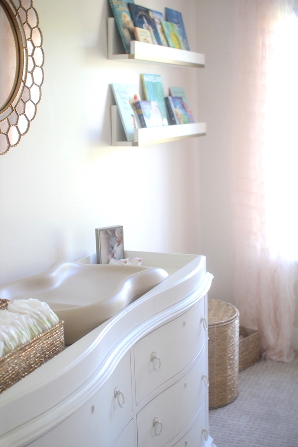 The gold hamper, baskets, and mirror are little touches of gold from Pottery Barn Kids. The dresser and changing table is from Restoration Hardware Baby.