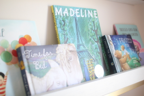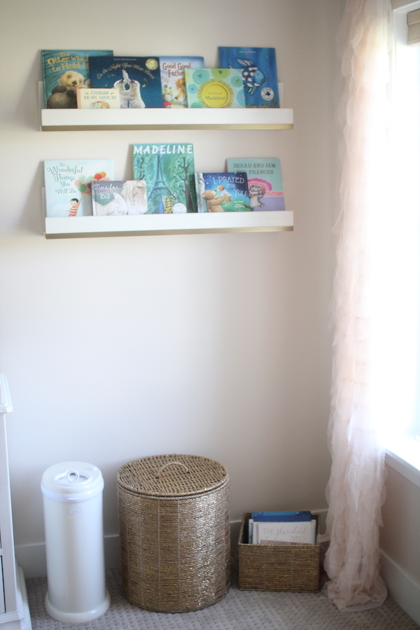 I knew that I wanted bookshelves somewhere in the room, so we got hanging shelves, as we didn't have much floor space in the room. They are from Restoration Hardware Baby.
