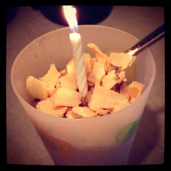 The next day, (on my actual birthday), I started the day off right with a birthday cake protein shake with cone crushed on top...And of course a candle!